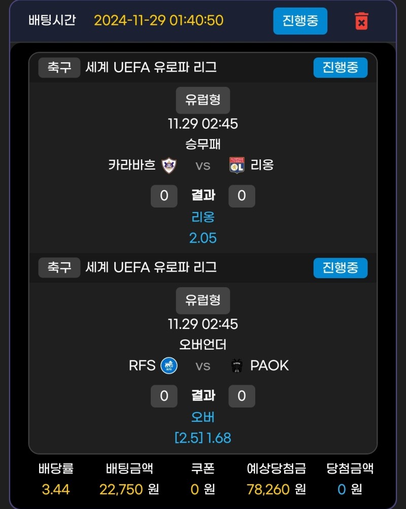 배틀픽으로 선픽 결정 + 작성자 정보 대수성쪽지보내기 자기소개 닉네임으로 검색쪽지보내기 자기소개 닉네임으로 검색 작성 작성일 2024.11.29 01:41 컨텐츠 정보 158 조회 6 댓글 0 추천 목록 본문 이번주 첫승 도전 ㅡ 0 추천 관련자료 이전 수성이 왜안자노 작성일 2024.11.29 02:24 다음 이만 퇴갤 작성일 2024.11.29 01:38 댓글 6 김배틀님의 댓글 김배틀쪽지보내기 자기소개 닉네임으로 검색쪽지보내기 자기소개 닉네임으로 검색 작성일 2024.11.29 01:54 오 그래도 메인뱃은 리옹 승 배당이 좋네요 건승입니다!! 오 그래도 메인뱃은 리옹 승 배당이 좋네요 건승입니다!! 인생은도박이다님의 댓글 인생은도박이다쪽지보내기 자기소개 닉네임으로 검색쪽지보내기 자기소개 닉네임으로 검색 작성일 2024.11.29 02:11 굿 럭 굿 럭 기커조님의 댓글 기커조쪽지보내기 자기소개 닉네임으로 검색쪽지보내기 자기소개 닉네임으로 검색 작성일 2024.11.29 02:14 건승하세요 건승하세요 로로랜드님의 댓글 로로랜드쪽지보내기 자기소개 닉네임으로 검색쪽지보내기 자기소개 닉네임으로 검색 작성일 2024.11.29 02:33 건승!!! 건승!!! 근본으로님의 댓글 근본으로쪽지보내기 자기소개 닉네임으로 검색쪽지보내기 자기소개 닉네임으로 검색 작성일 2024.11.29 13:34 건승 건승 독사님의 댓글 독사쪽지보내기 자기소개 닉네임으로 검색쪽지보내기 자기소개 닉네임으로 검색 작성일 2024.11.29 19:35 결정ㅅㅅㅅ 결정ㅅㅅㅅ 로그인한 회원만 댓글 등록이 가능합니다. 목록