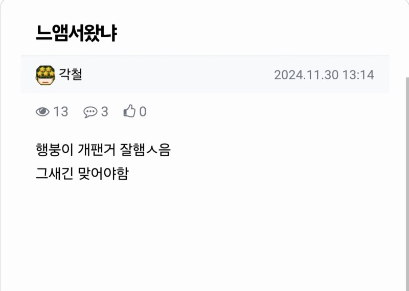 잘하는토붕이님의 댓글 잘하는토붕이쪽지보내기 자기소개 닉네임으로 검색쪽지보내기 자기소개 닉네임으로 검색 작성일 2024.12.02 14:34 못배운새끼 언급자제좀 못배운새끼 언급자제좀