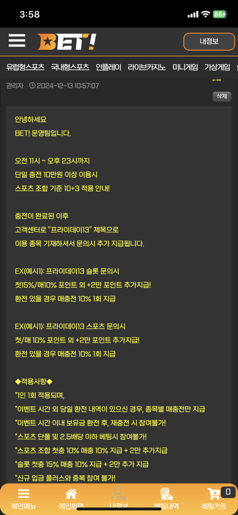 BET! 13일의 금요일 이벤트하네요 작성자 정보 발베르데데쪽지보내기 자기소개 닉네임으로 검색쪽지보내기 자기소개 닉네임으로 검색 작성 작성일 2024.12.13 15:58 컨텐츠 정보 73 조회 2 댓글 0 추천 목록 본문 10+3 좋네요 0 추천 관련자료 이전 각철이 씨 밸럼 작성일 2024.12.13 16:00 다음 엽기떡볶이 작성일 2024.12.13 15:57 댓글 2 달먹님의 댓글 달먹쪽지보내기 자기소개 닉네임으로 검색쪽지보내기 자기소개 닉네임으로 검색 작성일 2024.12.13 17:47 이미 받았져 ㅋㅋㅋ 이미 받았져 ㅋㅋㅋ 토지노프2님의 댓글 토지노프2쪽지보내기 자기소개 닉네임으로 검색쪽지보내기 자기소개 닉네임으로 검색 작성일 2024.12.14 11:31 좋네요 좋네요 로그인한 회원만 댓글 등록이 가능합니다. 목록