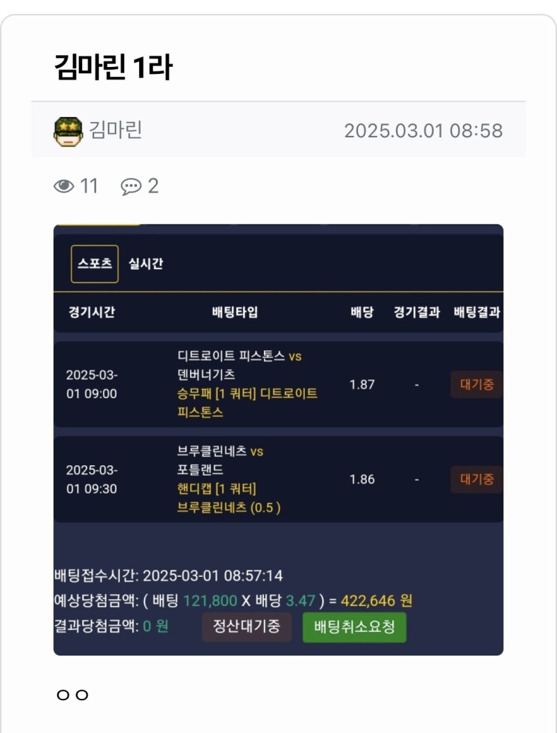 [필독]마당발,김마린 낙 ㅂㅂ 작성자 정보 각철쪽지보내기 자기소개 닉네임으로 검색쪽지보내기 자기소개 닉네임으로 검색 작성 작성일 2025.03.01 10:29 컨텐츠 정보 78 조회 6 댓글 1 추천 목록 본문 경기시작 10분전 올리기 아직 모르노?? 1 추천 관련자료 이전 나 아예 실격임? 아니면 또 올리는거 가능? 작성일 2025.03.01 10:36 다음 뮌헨 극장골뭐야 작성일 2025.03.01 10:26 댓글 6 마당발님의 댓글 마당발쪽지보내기 자기소개 닉네임으로 검색쪽지보내기 자기소개 닉네임으로 검색 작성일 2025.03.01 10:31 아 맞다 아 맞다 각철님의 댓글 각철쪽지보내기 자기소개 닉네임으로 검색쪽지보내기 자기소개 닉네임으로 검색 작성일 2025.03.01 11:11 아 근데 김마린은 어차피 올낙이네 아 근데 김마린은 어차피 올낙이네 기커조님의 댓글 기커조쪽지보내기 자기소개 닉네임으로 검색쪽지보내기 자기소개 닉네임으로 검색 작성일 2025.03.01 11:57 규정 ㄷㄷ 규정 ㄷㄷ 독사님의 댓글 독사쪽지보내기 자기소개 닉네임으로 검색쪽지보내기 자기소개 닉네임으로 검색 작성일 2025.03.01 12:38 실격ㅌ 실격ㅌ 두두님의 댓글 두두쪽지보내기 자기소개 닉네임으로 검색쪽지보내기 자기소개 닉네임으로 검색 작성일 2025.03.01 17:39 아숩노 아숩노 스테판커쇼님의 댓글 스테판커쇼쪽지보내기 자기소개 닉네임으로 검색쪽지보내기 자기소개 닉네임으로 검색 작성일 2025.03.01 18:11 레알 인정 레알 인정 로그인한 회원만 댓글 등록이 가능합니다. 목록