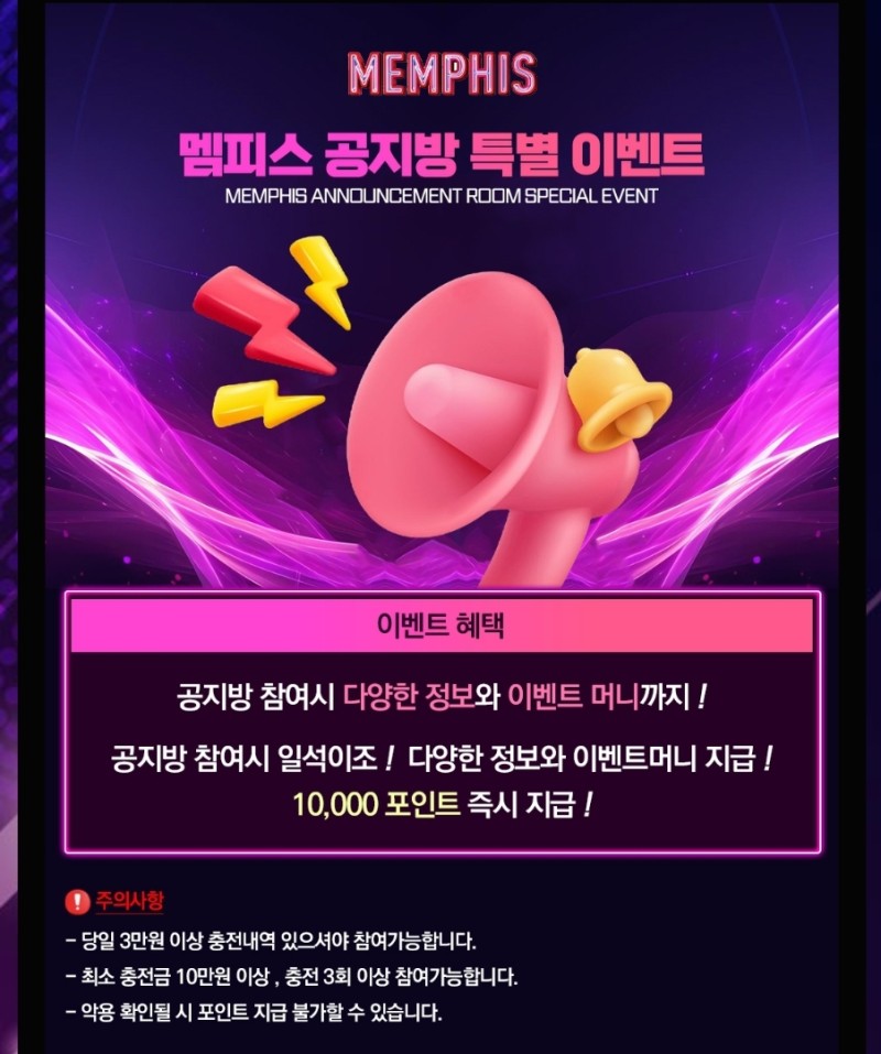 메인은 지금 첫충 10% 매충5%지만 멤피스는 첫충 10%매충10%라 매력적입니다. 그리고 목요일 15%도 동일하네요!