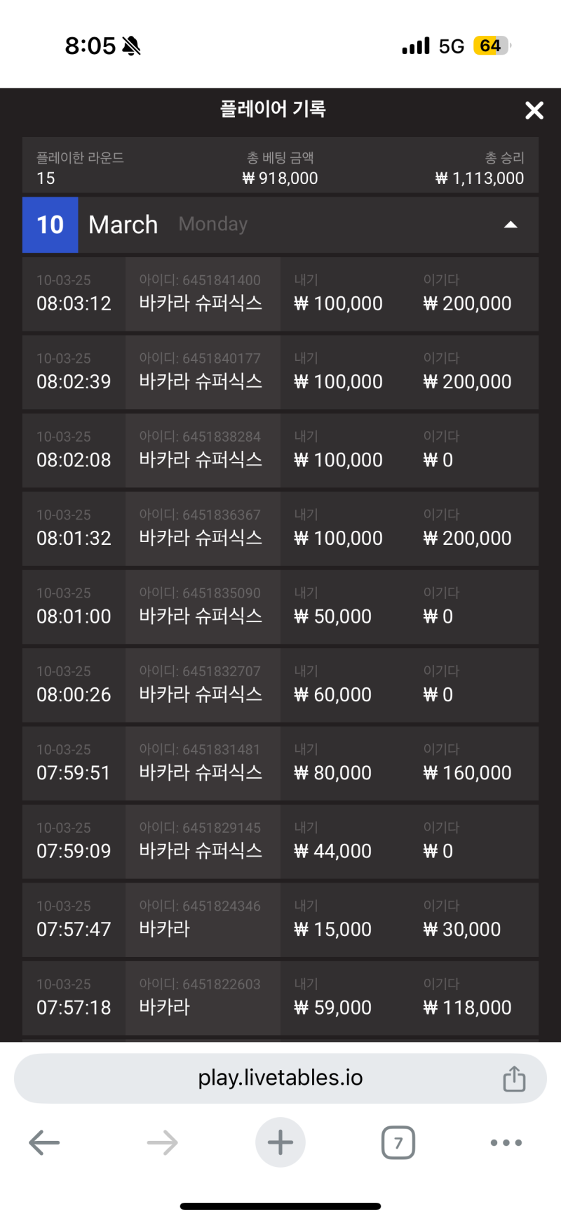 중간에 오링날뻔;; 5만원 남아서 5콩 플올인했는데 뱅7ㅋㅋ 근데