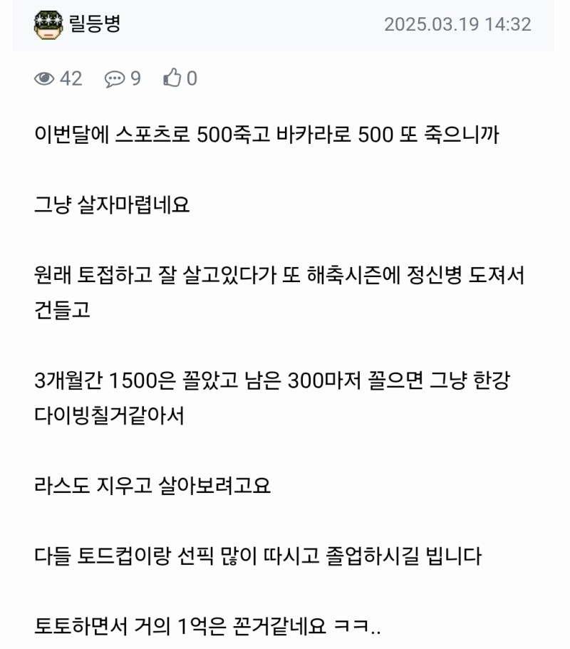 요즘 안보이는 사람 2 작성자 정보 독사쪽지보내기 자기소개 닉네임으로 검색쪽지보내기 자기소개 닉네임으로 검색 작성 작성일 2025.04.22 11:15 컨텐츠 정보 46 조회 7 댓글 0 추천 목록 본문 릴여경 0 추천 관련자료 이전 요즘 안보이는 사람 3 작성일 2025.04.22 11:18 다음 요즘 안보이는 사람 작성일 2025.04.22 11:14 댓글 7 인생은도박이다님의 댓글 인생은도박이다쪽지보내기 자기소개 닉네임으로 검색쪽지보내기 자기소개 닉네임으로 검색 작성일 2025.04.22 11:25 토접 ㄷㄷㄷ 토접 ㄷㄷㄷ 스테판커쇼님의 댓글 스테판커쇼쪽지보내기 자기소개 닉네임으로 검색쪽지보내기 자기소개 닉네임으로 검색 작성일 2025.04.22 11:57 한달 순삭 한달 순삭 켄트퍼플님의 댓글 켄트퍼플쪽지보내기 자기소개 닉네임으로 검색쪽지보내기 자기소개 닉네임으로 검색 작성일 2025.04.22 12:00 그러게요 그러게요 기커조님의 댓글 기커조쪽지보내기 자기소개 닉네임으로 검색쪽지보내기 자기소개 닉네임으로 검색 작성일 2025.04.22 13:01 접으신듯 접으신듯 먼짝귀1111님의 댓글 먼짝귀1111쪽지보내기 자기소개 닉네임으로 검색쪽지보내기 자기소개 닉네임으로 검색 작성일 2025.04.22 18:53 오키 오키 두두님의 댓글 두두쪽지보내기 자기소개 닉네임으로 검색쪽지보내기 자기소개 닉네임으로 검색 작성일 2025.04.22 20:38 누구노 누구노 마당발님의 댓글 마당발쪽지보내기 자기소개 닉네임으로 검색쪽지보내기 자기소개 닉네임으로 검색 작성일 2025.04.23 08:33 토접이 승리자 토접이 승리자 로그인한 회원만 댓글 등록이 가능합니다. 목록