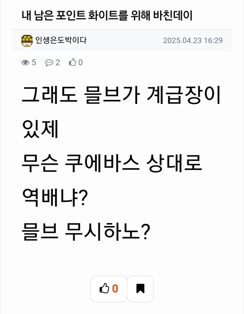 조트의 한 수 작성자 정보 인생은도박이다쪽지보내기 자기소개 닉네임으로 검색쪽지보내기 자기소개 닉네임으로 검색 작성 작성일 2025.04.23 21:44 컨텐츠 정보 26 조회 4 댓글 0 추천 목록 본문 LA다저스 출신이 우습노? 으데 근본없는 쿠에바스보다 저평가를 하노? 짭찬호 고맙다 역배 달달하데이 0 추천 관련자료 이전 연패 끊었다 작성일 2025.04.23 21:45 다음 김윤하 대 김유성 작성일 2025.04.23 21:41 댓글 4 기커조님의 댓글 기커조쪽지보내기 자기소개 닉네임으로 검색쪽지보내기 자기소개 닉네임으로 검색 작성일 2025.04.23 22:06 축하요 ㅅㅅ 축하요 ㅅㅅ 스테판커쇼님의 댓글 스테판커쇼쪽지보내기 자기소개 닉네임으로 검색쪽지보내기 자기소개 닉네임으로 검색 작성일 2025.04.23 22:18 축하드려요 축하드려요 마당발님의 댓글 마당발쪽지보내기 자기소개 닉네임으로 검색쪽지보내기 자기소개 닉네임으로 검색 작성일 2025.04.24 05:13 캬 캬 먼짝귀1111님의 댓글 먼짝귀1111쪽지보내기 자기소개 닉네임으로 검색쪽지보내기 자기소개 닉네임으로 검색 작성일 2025.04.24 16:05 후달달 후달달 로그인한 회원만 댓글 등록이 가능합니다. 목록