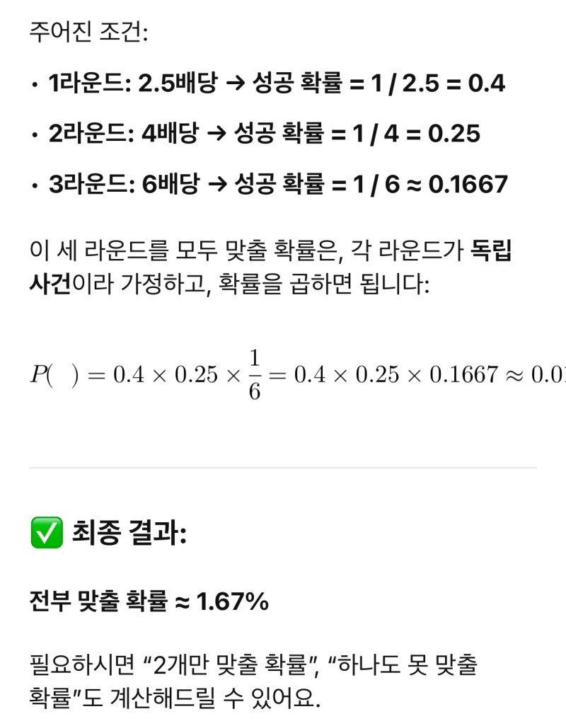 Chatgpt와 알아보는 토드컵 확률 작성자 정보 흑자머신쪽지보내기 자기소개 닉네임으로 검색쪽지보내기 자기소개 닉네임으로 검색 작성 작성일 2025.06.02 17:44 컨텐츠 정보 74 조회 6 댓글 0 추천 목록 본문 선픽이벤이랑 마찬가지로 최저배당 기준 3라운드 배당 젤 높은 사람이 우승하는 것도 생각 안 했음 이것저것 다 포함하면 1퍼센트도 안 되겠네 ㄷㄷㄷㄷ 0 추천 관련자료 이전 은하단좌 누구세요 ㄷㄷㄷㄷ 작성일 2025.06.02 17:45 다음 할매 사랑해 ㅅㅅㅅㅅㅅㅅㅅㅅㅅㅅ 작성일 2025.06.02 17:44 댓글 6 인생은도박이다님의 댓글 인생은도박이다쪽지보내기 자기소개 닉네임으로 검색쪽지보내기 자기소개 닉네임으로 검색 작성일 2025.06.02 19:39 인생은 1%다. 인생은 1%다. 두두님의 댓글 두두쪽지보내기 자기소개 닉네임으로 검색쪽지보내기 자기소개 닉네임으로 검색 작성일 2025.06.03 07:46 과연 과연 켄트퍼플님의 댓글 켄트퍼플쪽지보내기 자기소개 닉네임으로 검색쪽지보내기 자기소개 닉네임으로 검색 작성일 2025.06.03 10:06 오키 오키 기커조님의 댓글 기커조쪽지보내기 자기소개 닉네임으로 검색쪽지보내기 자기소개 닉네임으로 검색 작성일 2025.06.03 11:17 어렵다 어렵다 스테판커쇼님의 댓글 스테판커쇼쪽지보내기 자기소개 닉네임으로 검색쪽지보내기 자기소개 닉네임으로 검색 작성일 2025.06.03 12:45 후덜덜 후덜덜 먼짝귀1111님의 댓글 먼짝귀1111쪽지보내기 자기소개 닉네임으로 검색쪽지보내기 자기소개 닉네임으로 검색 작성일 2025.06.03 14:42 덜덜 덜덜 로그인한 회원만 댓글 등록이 가능합니다. 목록