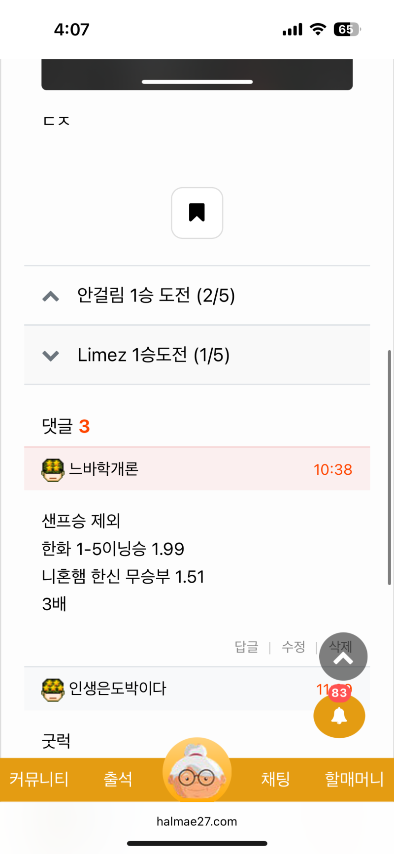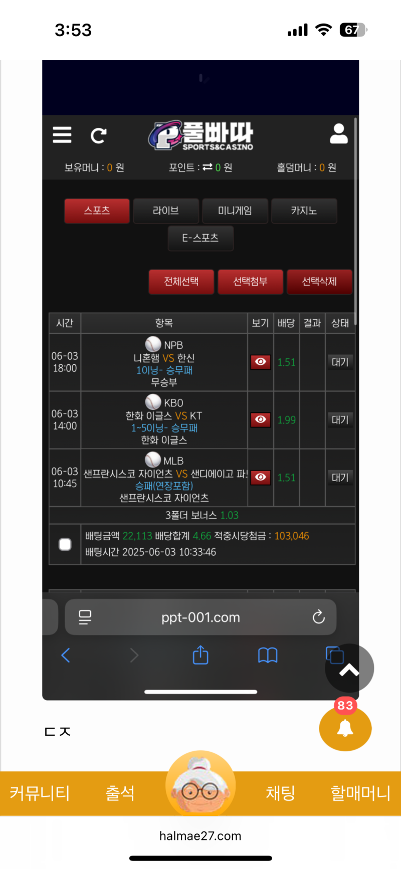 한신 1이닝 무 3배 댓글달고 베팅했는데