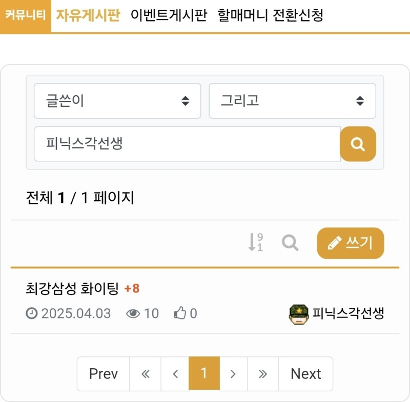 요즘 안보이는 사람 작성자 정보 독사쪽지보내기 자기소개 닉네임으로 검색쪽지보내기 자기소개 닉네임으로 검색 작성 작성일 2025.06.10 13:11 컨텐츠 정보 61 조회 3 댓글 0 추천 목록 관리 글검색 본문 피각 0 추천 관련자료 이전 요즘 안보이는 사람 2 작성일 2025.06.10 13:12 다음 잉더박 1승 도전 픽 탑승대기 작성일 2025.06.10 12:44 댓글 3 인생은도박이다님의 댓글 인생은도박이다쪽지보내기 자기소개 닉네임으로 검색쪽지보내기 자기소개 닉네임으로 검색 작성일 2025.06.10 13:13 최약 삼성과 함께 몰락! 최약 삼성과 함께 몰락! 스테판커쇼님의 댓글 스테판커쇼쪽지보내기 자기소개 닉네임으로 검색쪽지보내기 자기소개 닉네임으로 검색 작성일 2025.06.11 09:05 피각 ㄷ 피각 ㄷ 기커조님의 댓글 기커조쪽지보내기 자기소개 닉네임으로 검색쪽지보내기 자기소개 닉네임으로 검색 작성일 2025.06.11 12:38 안보이네 안보이네 로그인한 회원만 댓글 등록이 가능합니다. 목록 관리 글검색