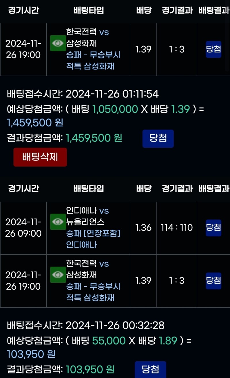 한전 VS 삼화 경기 삼화일반승에 100콩 배팅했습니다.