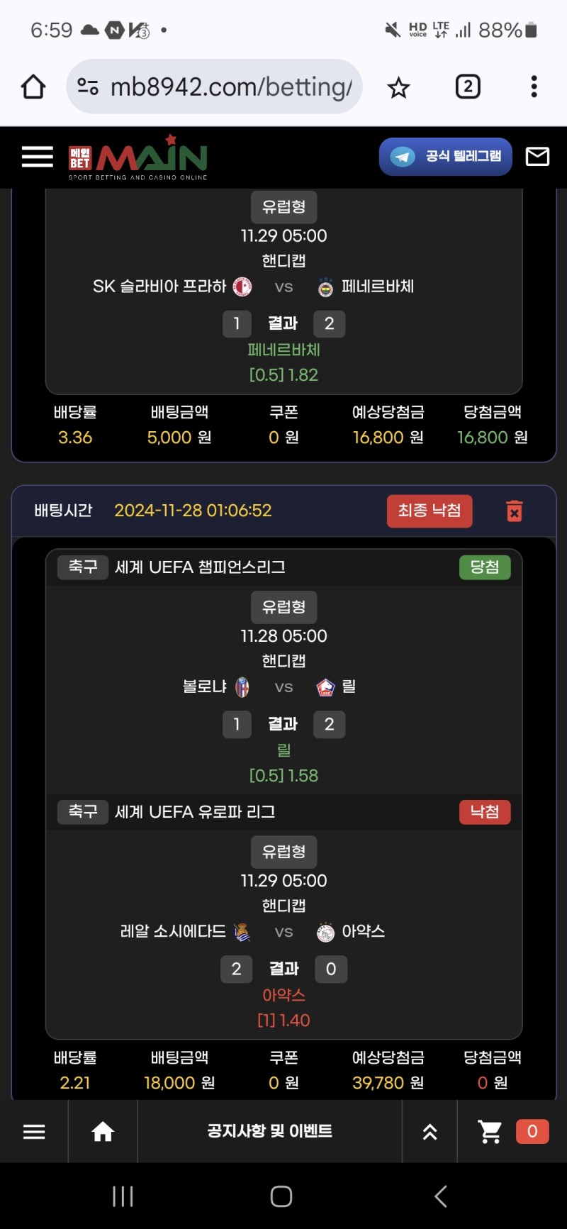 아약스가 골대두번맞히고 후반에2실정 을하면서나가리가됬네요 하지만 충포로걸어둔게맞았습니당..