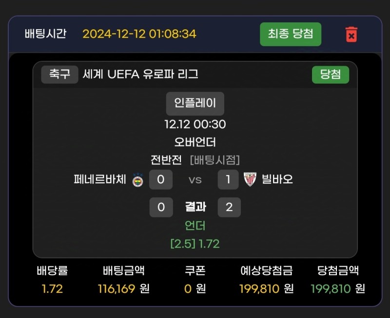 메인벳 페네르바체vs빌바오 후기 작성자 정보 마당발쪽지보내기 자기소개 닉네임으로 검색쪽지보내기 자기소개 닉네임으로 검색 작성 작성일 2024.12.12 22:56 컨텐츠 정보 235 조회 2 댓글 0 추천 목록 관리 글검색 본문 1대0상황에서 2.5언더 배팅 바로 한골 넣었으나 기적의 전두언 페네르바체가 한명 퇴장당해 승패가 사실상 정해지고 양팀이 설렁설렁한게 주효한듯 0 추천 관련자료 이전 레드불 휴스턴vs골스 후기 작성일 2024.12.12 23:00 다음 쇼미더벳 안양정관장vs서울삼성 후기 작성일 2024.12.11 21:32 댓글 2 기커조님의 댓글 기커조쪽지보내기 자기소개 닉네임으로 검색쪽지보내기 자기소개 닉네임으로 검색 작성일 2024.12.12 23:46 당첨축하요 당첨축하요 토태님의 댓글 토태쪽지보내기 자기소개 닉네임으로 검색쪽지보내기 자기소개 닉네임으로 검색 작성일 2025.01.31 23:36 축하드려여 축하드려여 로그인한 회원만 댓글 등록이 가능합니다. 목록 관리 글검색