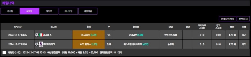아니 12월17일 본머스경기를 배팅하기위해 아보크에 들어와서