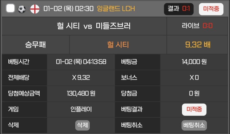 0:0 진행중 누구하나 한골 넣을거같아서 0.5오바말고 헐시티승 역배 갔는데