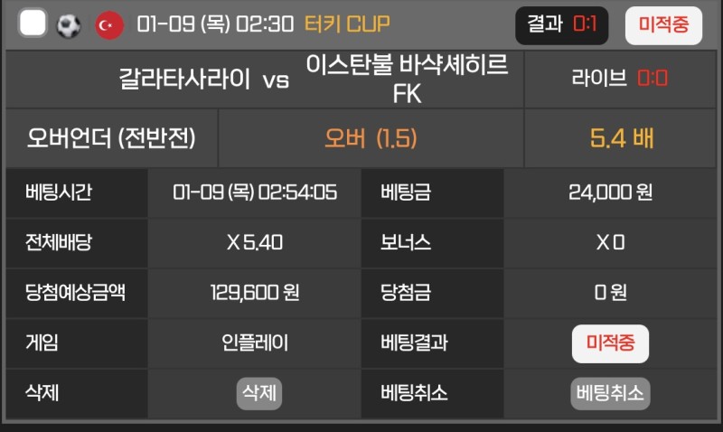 전반 항상 득점 하던 갈라고 1-1 전반 뜰거같아서 전반 22분 1.5옵 탑승..