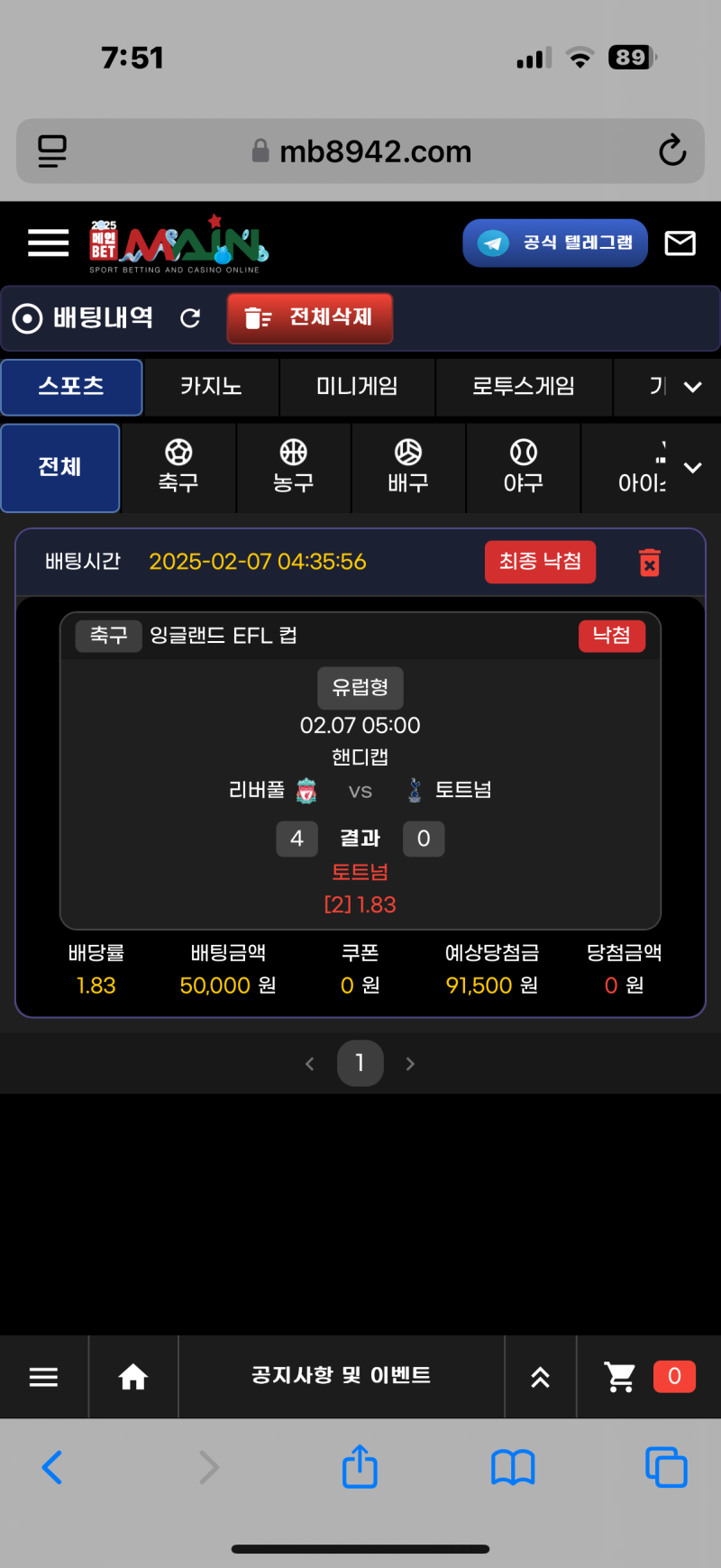 오랜만에 메인벳으로 베팅하였다. 저번에 토트넘이 이겨 그래도 2첨차넘게 지진않겠지하고 베팅하였고, 전반까지만해도 1점만먹혀 할만하겠다했지만 자고일어나니 ㅅㅂ4점차가 되어 여행갔는데도 슬펐따...
