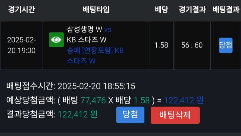 쇼미더벳 삼성생명vs국민은행 후기 작성자 정보 마당발쪽지보내기 자기소개 닉네임으로 검색쪽지보내기 자기소개 닉네임으로 검색 작성 작성일 2025.02.20 21:14 컨텐츠 정보 914 조회 1 댓글 0 추천 목록 관리 글검색 본문 4위가 걸린 경기라서 국민 승에 배팅 전반 10점넘게 이기다가 역전당해서 쫄았는데 재역전 승리 0 추천 관련자료 이전 풀빠따 플젠vs페렌츠바로시 후기 작성일 2025.02.21 22:01 다음 쇼미더벳 일본vs한국 후기 작성일 2025.02.20 21:12 댓글 1 기커조님의 댓글 기커조쪽지보내기 자기소개 닉네임으로 검색쪽지보내기 자기소개 닉네임으로 검색 작성일 2025.02.20 21:17 당첨축하요 당첨축하요 로그인한 회원만 댓글 등록이 가능합니다. 목록 관리 글검색