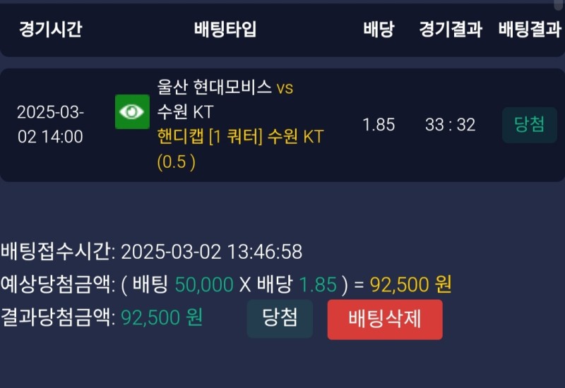 레드불 울산모비스vs수원KT 후기 작성자 정보 마당발쪽지보내기 자기소개 닉네임으로 검색쪽지보내기 자기소개 닉네임으로 검색 작성 작성일 2025.03.02 14:48 컨텐츠 정보 775 조회 1 댓글 0 추천 목록 관리 글검색 본문 선발 라인업 보니까 kt가 더 세보여서 1쿼터 0.5플핸 배팅 모비스가 계속 3~5점차씩 앞서나가다가 쿼터 막판 역전하면서 적중 0 추천 관련자료 이전 풀빠따 현대건설vs지에스칼텍스 후기 작성일 2025.03.02 18:46 다음 레드불 카르민코프vs프나틱 후기 작성일 2025.03.02 13:32 댓글 1 기커조님의 댓글 기커조쪽지보내기 자기소개 닉네임으로 검색쪽지보내기 자기소개 닉네임으로 검색 작성일 2025.03.02 17:11 당첨축하요 당첨축하요 로그인한 회원만 댓글 등록이 가능합니다. 목록 관리 글검색