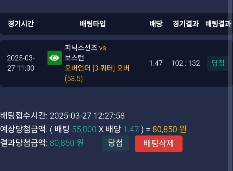 레드불 보스턴vs피닉스 후기 작성자 정보 마당발쪽지보내기 자기소개 닉네임으로 검색쪽지보내기 자기소개 닉네임으로 검색 작성 작성일 2025.03.27 21:50 컨텐츠 정보 932 조회 1 댓글 0 추천 목록 관리 글검색 본문 1쿼터 점수 엄청나게 많이 넣고 2쿼터는 놀길래 3쿼터는 많이 넣을 것 같아서 오버 베팅 기준점 제일 낮게 간게 무색하게 또 엄청나게 많이 넣으면서 적중 0 추천 관련자료 이전 쇼미더벳 기아vs키움 후기 작성일 2025.03.27 22:22 다음 풀빠따 덴버vs밀워키 후기 작성일 2025.03.27 21:43 댓글 1 기커조님의 댓글 기커조쪽지보내기 자기소개 닉네임으로 검색쪽지보내기 자기소개 닉네임으로 검색 작성일 2025.03.27 22:13 당첨축하요 당첨축하요 로그인한 회원만 댓글 등록이 가능합니다. 목록 관리 글검색