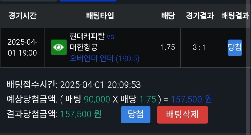 세트스코어 1대1일때 현캐가 3대1로 이길 것 같아서 3대1 스코어 베팅하려다가 언더가 배당이 좀 더 좋아서 베팅