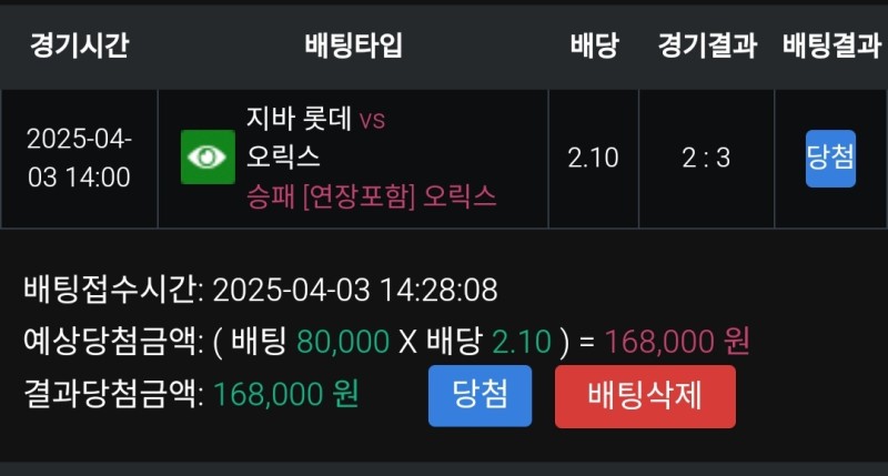 풀빠따 치바롯데vs오릭스 후기 작성자 정보 마당발쪽지보내기 자기소개 닉네임으로 검색쪽지보내기 자기소개 닉네임으로 검색 작성 작성일 2025.04.03 21:49 컨텐츠 정보 936 조회 1 댓글 0 추천 목록 관리 글검색 본문 롯데 선발 이시카와 슈타가 위협구로 일찍 퇴장당하고 불펜을 일찍써서 뒷심이 딸릴 것 같아 실시간 오릭스 베팅 오릭스 물타선이 힘내주며 8회초 역전하고 그대로 승리 0 추천 관련자료 이전 레드불 농심vs브리온 후기 작성일 2025.04.03 22:17 다음 레드불 엘지vsKT 후기 작성일 2025.04.03 21:47 댓글 1 기커조님의 댓글 기커조쪽지보내기 자기소개 닉네임으로 검색쪽지보내기 자기소개 닉네임으로 검색 작성일 2025.04.03 21:54 축하합니다 축하합니다 로그인한 회원만 댓글 등록이 가능합니다. 목록 관리 글검색