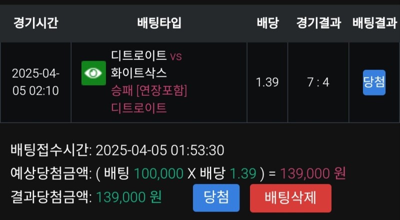풀빠따 화이트삭스vs디트 후기 작성자 정보 마당발쪽지보내기 자기소개 닉네임으로 검색쪽지보내기 자기소개 닉네임으로 검색 작성 작성일 2025.04.05 19:28 컨텐츠 정보 938 조회 2 댓글 0 추천 목록 관리 글검색 본문 싹반꿀 베팅해서 성공 0 추천 관련자료 이전 쇼미더벳 메츠vs토론토 후기 작성일 2025.04.05 19:33 다음 레드불 양키스vs애리조나 후기 작성일 2025.04.04 23:48 댓글 2 기커조님의 댓글 기커조쪽지보내기 자기소개 닉네임으로 검색쪽지보내기 자기소개 닉네임으로 검색 작성일 2025.04.05 19:50 당첨축하요 당첨축하요 맞추고싶어님의 댓글 맞추고싶어쪽지보내기 자기소개 닉네임으로 검색쪽지보내기 자기소개 닉네임으로 검색 작성일 2025.04.05 22:22 축하 축하 로그인한 회원만 댓글 등록이 가능합니다. 목록 관리 글검색