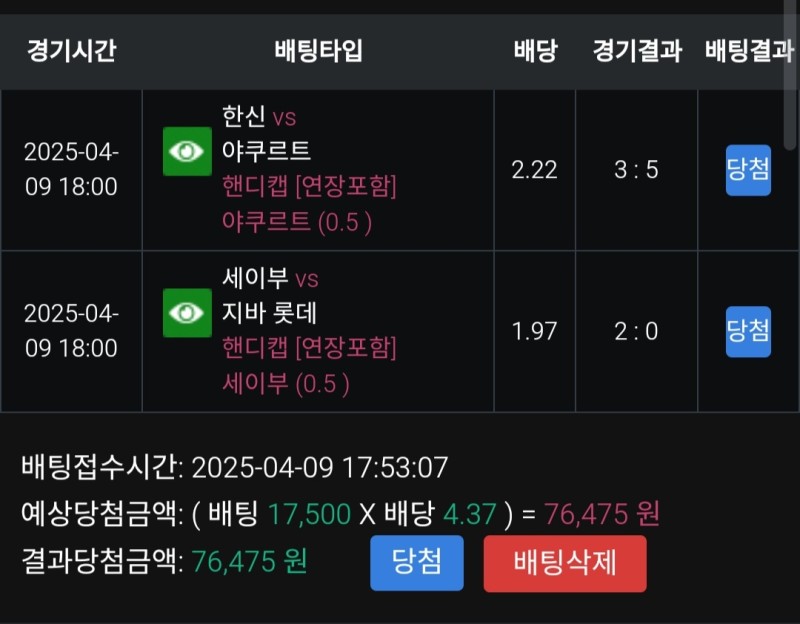 풀빠따 야쿠르트vs한신 후기 작성자 정보 마당발쪽지보내기 자기소개 닉네임으로 검색쪽지보내기 자기소개 닉네임으로 검색 작성 작성일 2025.04.09 22:08 컨텐츠 정보 974 조회 1 댓글 0 추천 목록 관리 글검색 본문 오랜만에 나오는 야쿠선발 이시카와 할배 반가워서 베팅 한신한테 3점 먼저 따여서 사실 포기했었지만 어떻게 후반 불펜 털고 역전승 0 추천 관련자료 이전 풀빠따 소프트뱅크vs오릭스 후기 작성일 2025.04.09 22:10 다음 풀빠따 주니치vs히로시마 후기 작성일 2025.04.09 22:06 댓글 1 기커조님의 댓글 기커조쪽지보내기 자기소개 닉네임으로 검색쪽지보내기 자기소개 닉네임으로 검색 작성일 2025.04.09 22:11 적중축하요 적중축하요 로그인한 회원만 댓글 등록이 가능합니다. 목록 관리 글검색
