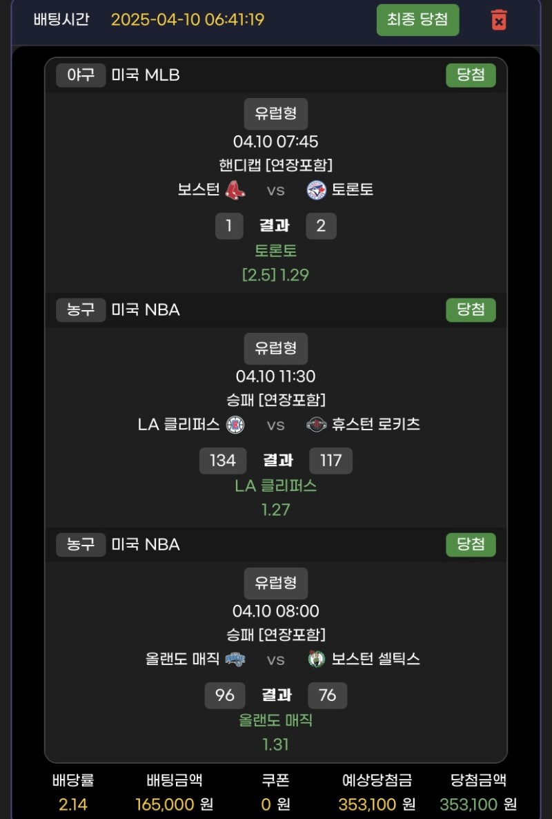 메인벳 후기 작성자 정보 안걸림쪽지보내기 자기소개 닉네임으로 검색쪽지보내기 자기소개 닉네임으로 검색 작성 작성일 2025.04.10 18:54 컨텐츠 정보 968 조회 1 댓글 0 추천 목록 본문 당과낙 0 추천 관련자료 이전 레드불 시카고불스vs마이애미 후기 작성일 2025.04.10 21:24 다음 돌직구 낙첨 작성일 2025.04.10 17:29 댓글 1 기커조님의 댓글 기커조쪽지보내기 자기소개 닉네임으로 검색쪽지보내기 자기소개 닉네임으로 검색 작성일 2025.04.10 19:05 당첨금액이 더크네요 축하요 당첨금액이 더크네요 축하요 로그인한 회원만 댓글 등록이 가능합니다. 목록