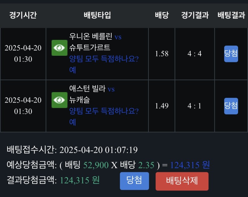 쇼미더벳 ) 적중후기 2!! 작성자 정보 낭만권위자야쪽지보내기 자기소개 닉네임으로 검색쪽지보내기 자기소개 닉네임으로 검색 작성 작성일 2025.04.20 04:37 컨텐츠 정보 954 조회 1 댓글 0 추천 목록 본문 쌍양득 독일 슈트 양득 예에 .. 뉴캐 아스톤 양득 예 아스톤 홈에서잘패길래 전반 1-1 후반 아스톤빌라 세골박아서 4-1 최종 스코어 종료 양득둘다 전반 퇴근 시켜줌 ㅅㅅ 0 추천 관련자료 이전 메인벳 ) 스포츠후기 작성일 2025.04.20 08:46 다음 멤피스) 보너스 받은거로 다폴 ㅅㅅ 작성일 2025.04.20 02:32 댓글 1 기커조님의 댓글 기커조쪽지보내기 자기소개 닉네임으로 검색쪽지보내기 자기소개 닉네임으로 검색 작성일 2025.04.20 10:59 당첨축하요 당첨축하요 로그인한 회원만 댓글 등록이 가능합니다. 목록