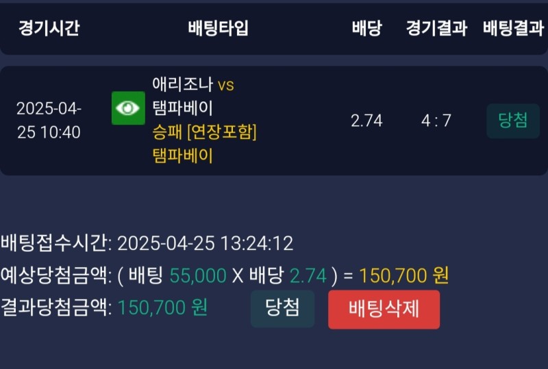 레드불 템파베이vs애리조나 후기 작성자 정보 마당발쪽지보내기 자기소개 닉네임으로 검색쪽지보내기 자기소개 닉네임으로 검색 작성 작성일 2025.04.25 22:05 컨텐츠 정보 922 조회 2 댓글 0 추천 목록 관리 글검색 본문 9회초 템파베이가 극적으로 동점만들고 이닝 넘어가길래 어제처럼 연장가서 이길 것 같아 실시간 베팅 9회말 잘 막고 연장가서 홈런으로 3점내서 승리 0 추천 관련자료 이전 레드불 오클라호마vs멤피스 후기 작성일 2025.04.25 22:07 다음 레드불 소프트뱅크vs라쿠텐 후기 작성일 2025.04.25 22:03 댓글 2 기커조님의 댓글 기커조쪽지보내기 자기소개 닉네임으로 검색쪽지보내기 자기소개 닉네임으로 검색 작성일 2025.04.25 22:08 축하합니다 축하합니다 맥콜제로2님의 댓글 맥콜제로2쪽지보내기 자기소개 닉네임으로 검색쪽지보내기 자기소개 닉네임으로 검색 작성일 2025.04.26 02:46 축하드립니다 축하드립니다 로그인한 회원만 댓글 등록이 가능합니다. 목록 관리 글검색