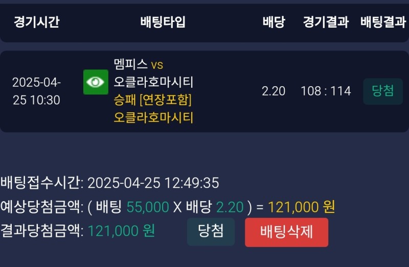 레드불 오클라호마vs멤피스 후기 작성자 정보 마당발쪽지보내기 자기소개 닉네임으로 검색쪽지보내기 자기소개 닉네임으로 검색 작성 작성일 2025.04.25 22:07 컨텐츠 정보 921 조회 2 댓글 0 추천 목록 관리 글검색 본문 3쿼터 13점차로 멤피스가 이길때 7배 오클 가려다가 쫄려서 못갔는데 4쿼터에도 2배나 주길래 베팅 모란트가 없으니 오클라호마의 질식수비에 막히며 적중 0 추천 관련자료 이전 멤피스 ssg랜더스vs키움히어로즈 후기 작성일 2025.04.25 23:33 다음 레드불 템파베이vs애리조나 후기 작성일 2025.04.25 22:05 댓글 2 기커조님의 댓글 기커조쪽지보내기 자기소개 닉네임으로 검색쪽지보내기 자기소개 닉네임으로 검색 작성일 2025.04.25 22:08 당첨축하요 당첨축하요 맥콜제로2님의 댓글 맥콜제로2쪽지보내기 자기소개 닉네임으로 검색쪽지보내기 자기소개 닉네임으로 검색 작성일 2025.04.26 02:46 당첨축 당첨축 로그인한 회원만 댓글 등록이 가능합니다. 목록 관리 글검색