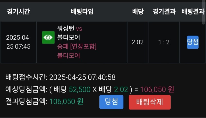 풀빠따 볼티vs워싱턴 후기 작성자 정보 마당발쪽지보내기 자기소개 닉네임으로 검색쪽지보내기 자기소개 닉네임으로 검색 작성 작성일 2025.04.25 23:48 컨텐츠 정보 930 조회 2 댓글 0 추천 목록 관리 글검색 본문 볼티 이길때 돼서 베팅 양팀 선발 둘 다 호투했지만 볼티가 1점 더 내면서 승리 0 추천 관련자료 이전 멤피스 애슬레틱스vs화이트삭스 후기 작성일 2025.04.26 23:50 다음 멤피스 kt위즈vs한화 후기 작성일 2025.04.25 23:37 댓글 2 기커조님의 댓글 기커조쪽지보내기 자기소개 닉네임으로 검색쪽지보내기 자기소개 닉네임으로 검색 작성일 2025.04.26 00:29 당첨축하요 당첨축하요 맥콜제로2님의 댓글 맥콜제로2쪽지보내기 자기소개 닉네임으로 검색쪽지보내기 자기소개 닉네임으로 검색 작성일 2025.04.26 02:44 당축 당축 로그인한 회원만 댓글 등록이 가능합니다. 목록 관리 글검색