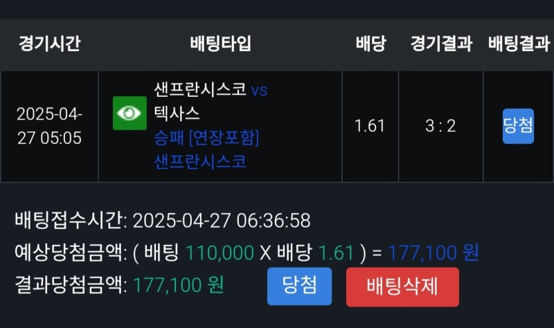 쇼미더벳 샌프vs텍사스 후기 작성자 정보 마당발쪽지보내기 자기소개 닉네임으로 검색쪽지보내기 자기소개 닉네임으로 검색 작성 작성일 2025.04.27 18:00 컨텐츠 정보 927 조회 1 댓글 0 추천 목록 관리 글검색 본문 텍사스 2대0으로 이기다가 5회말 2대2로 동점됐길래 실시간 샌프 베팅 텍사스 필승조들이 오늘 못나오는 상황이라서 샌프란시스코의 불펜 우위로 역전승 성공 0 추천 관련자료 이전 쇼미더벳 골스vs휴스턴 후기 작성일 2025.04.27 18:01 다음 풀빠따 올랜도vs보스턴 후기 작성일 2025.04.26 23:54 댓글 1 기커조님의 댓글 기커조쪽지보내기 자기소개 닉네임으로 검색쪽지보내기 자기소개 닉네임으로 검색 작성일 2025.04.27 20:25 축하합니다 축하합니다 로그인한 회원만 댓글 등록이 가능합니다. 목록 관리 글검색