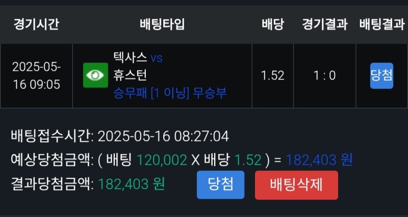 쇼미더벳 휴스턴vs텍사스 후기 작성자 정보 마당발쪽지보내기 자기소개 닉네임으로 검색쪽지보내기 자기소개 닉네임으로 검색 작성 작성일 2025.05.16 18:45 컨텐츠 정보 922 조회 2 댓글 0 추천 목록 관리 글검색 본문 요즘 제일 잘던지는 투수들 헌터 브라운, 디그롬이 나와서 1이닝 무승부 베팅 양 팀 하나의 출루도 허용하지 않으면서 무난하게 적중 0 추천 관련자료 이전 쇼미더벳 히로시마vs한신 후기 작성일 2025.05.16 23:52 다음 레드불 템파베이vs토론토 후기 작성일 2025.05.16 18:43 댓글 2 기커조님의 댓글 기커조쪽지보내기 자기소개 닉네임으로 검색쪽지보내기 자기소개 닉네임으로 검색 작성일 2025.05.16 19:11 축하합니다 축하합니다 은하단님의 댓글 은하단쪽지보내기 자기소개 닉네임으로 검색쪽지보내기 자기소개 닉네임으로 검색 작성일 2025.06.03 03:13 ㅊㅊ ㅊㅊ 로그인한 회원만 댓글 등록이 가능합니다. 목록 관리 글검색