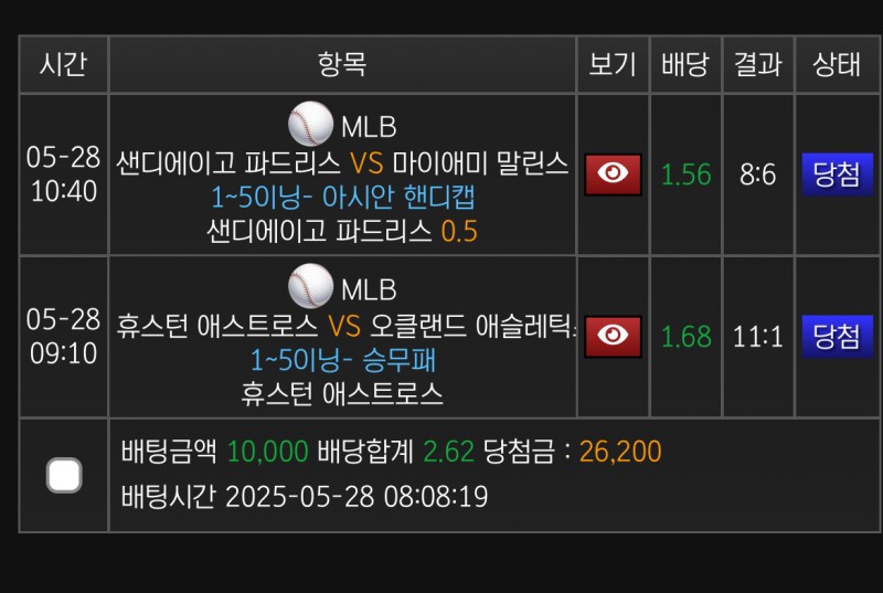 돌직구 MLB 적중후기 작성자 정보 흑자머신쪽지보내기 자기소개 닉네임으로 검색쪽지보내기 자기소개 닉네임으로 검색 작성 작성일 2025.05.28 14:16 컨텐츠 정보 943 조회 2 댓글 0 추천 목록 관리 글검색 본문 휴지는 초반부터 개패고 샌디도 1회 6점 쳐맞아놓고 결국엔 전반 역전했네요 ㄷㄷ 0 추천 관련자료 이전 레드불 mlb 미적 후기 작성일 2025.05.29 13:35 다음 돌직구 MLB 단폴 적중 후기 작성일 2025.05.28 14:15 댓글 2 기커조님의 댓글 기커조쪽지보내기 자기소개 닉네임으로 검색쪽지보내기 자기소개 닉네임으로 검색 작성일 2025.05.28 19:32 축하합니다 축하합니다 은하단님의 댓글 은하단쪽지보내기 자기소개 닉네임으로 검색쪽지보내기 자기소개 닉네임으로 검색 작성일 2025.06.02 15:43 역전ㄷㄷ 역전ㄷㄷ 로그인한 회원만 댓글 등록이 가능합니다. 목록 관리 글검색