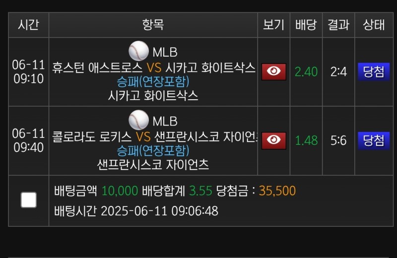 쇼미더벳 화이트삭스vs휴스턴 후기 작성자 정보 마당발쪽지보내기 자기소개 닉네임으로 검색쪽지보내기 자기소개 닉네임으로 검색 작성 작성일 2025.06.11 20:24 컨텐츠 정보 839 조회 1 댓글 0 추천 목록 관리 글검색 본문 화이트삭스 선발중 그나마 잘하는 스미스라서 베팅 0 추천 관련자료 이전 쇼미더벳 아르헨티나vs콜롬비아 후기 작성일 2025.06.11 20:25 다음 쇼미더벳 리히텐슈타인vs스코틀랜드 후기 작성일 2025.06.10 15:08 댓글 1 기커조님의 댓글 기커조쪽지보내기 자기소개 닉네임으로 검색쪽지보내기 자기소개 닉네임으로 검색 작성일 2025.06.12 12:53 당첨축하요 당첨축하요 로그인한 회원만 댓글 등록이 가능합니다. 목록 관리 글검색
