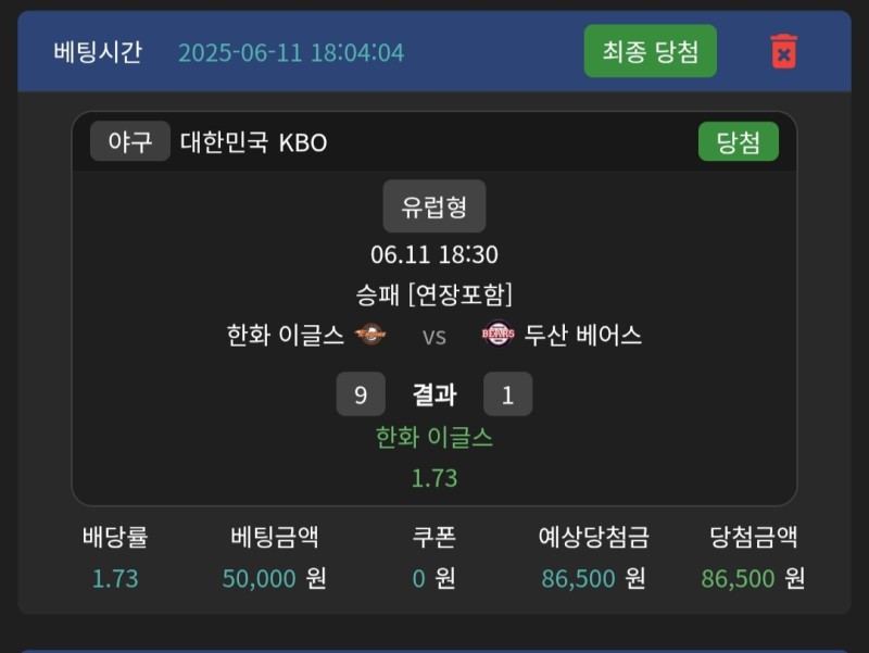 메인벳 한화vs두산 후기 작성자 정보 마당발쪽지보내기 자기소개 닉네임으로 검색쪽지보내기 자기소개 닉네임으로 검색 작성 작성일 2025.06.11 21:42 컨텐츠 정보 823 조회 1 댓글 0 추천 목록 관리 글검색 본문 오늘까지는 확실히 한화가 이길 것 같아서 베팅 0 추천 관련자료 이전 레드불 kt위즈vs롯데 후기 작성일 2025.06.11 21:51 다음 레드불 삼성vs기아 후기 작성일 2025.06.11 21:41 댓글 1 기커조님의 댓글 기커조쪽지보내기 자기소개 닉네임으로 검색쪽지보내기 자기소개 닉네임으로 검색 작성일 2025.06.12 13:06 축하합니다 축하합니다 로그인한 회원만 댓글 등록이 가능합니다. 목록 관리 글검색