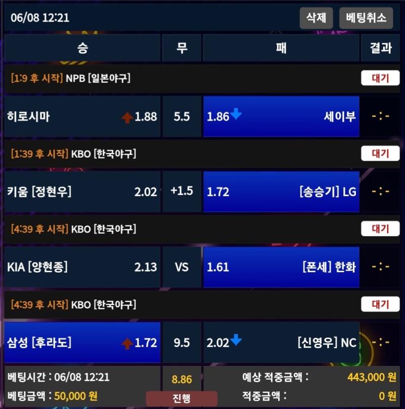 히로언더 엘지마핸 한화승 삼성오버 8.86배