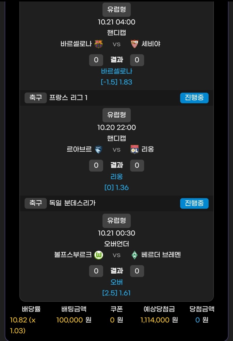 리옹 0핸디승 + 볼프스 2.5 옵 + 오세르 2.5 옵 + 베네치아 2.5 옵 + 바셀 -1.5 핸디승 = 10.82배